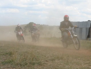 After handing out the new t-shirts, a few preliminary races were held before the the main race, the " 2 hour Postie race". Right from the first race young Jeremy was flying and showed himself to be the one to beat. Fourteen bikes started the 2 hour at around 4:30PM and right away it was Team Jeremy blowing them away with Team Blayney Boys close behind. My bike with Team "Step-thru n wolf" onboard was back in about 6th. Jeremy was out in front for a long time before the lead changed at the first rider change. Some bikes died, others broke chains, some conked out choked with dust. After about 1 and a bit hours, the Blayney Boys broke down then disappeared from the scene. This left Jeremy way out in front to claim victory over the Blayney Boys finally. Noel came 2nd and I don't know who came third. After the race we had a big BBQ and the guest band "Step-thru n wolf" played a mixture of rock classics for us all night and we all had a great time. |