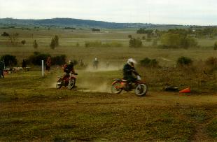 | The 'Chute' is a steep, slippery, uphill, hard right hander leading on to the finish line. Dean's brother Wayne making it look easy on his way to victory! | The Finish Line and Pit, Rider changeover area, and two demons battling it out for first place in the 1 Hour Enduro Race, eventualy won by Dean (left) | ||||||||||||||